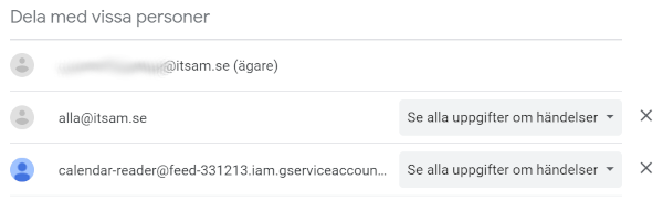 1. I kalenderns inställningar, lägg till så att servicekontot calendar-reader@feed-331213.iam.gserviceaccount.com har rättighet att läsa ifrån kalendern.